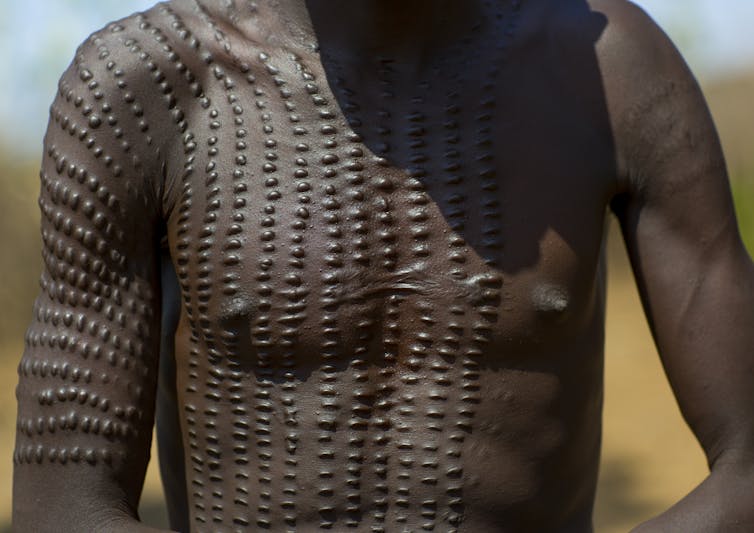 Other markings are records of significant events such as a death in the family. They can also symbolise belonging to a complex multi-levelled society. These marks indicated an individual’s age, medical history, and their social, political and gender-related status. Some marks are formed from the injection of medicines and substances believed to offer protection from unseen forces. Some were just creative expressions.